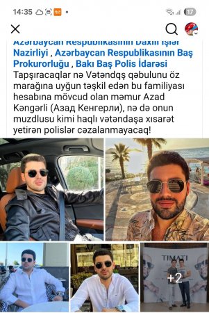 Mən milli-mentalitat hissimizə, məmur məsuliyyətinə sığmayan bu görüntüləri bütün dünyaya açıq instağram sosial şəbəkəsindən gÖtürmüşəm. Hələ mən Facebookda Azad Kəngərlinin nəinki AR Prezidentinin Adminstrasiyasının əməkdaşına, heç sıradan birinin sosial şəbəkədə yaymağa hüququ çatmayan son dərəcə ədəbsiz anekdotlarını utanıb işıqlandırmıram!