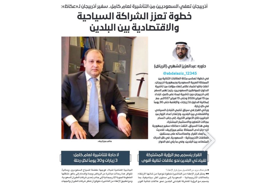 Səudiyyə Ərəbistanı Krallığının nüfuzlu "Okaz" qəzetində Azərbaycana səfər edən Səudiyyə Ərəbistanı vətəndaşları üçün tətbiq olunan birtərəfli və müddətli vizasız rejimlə bağlı məqalə dərc edilib.